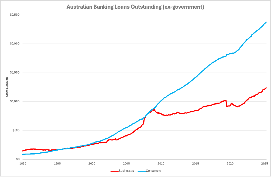 By choosing banking rules that economically favour mortgages over other uses of capital, bank balance sheets have flipped from ~2:1 business to mortgages to ~1:2 and fuelled a decades-long boom in mortgages, household leverage, housing prices and bank profitability.